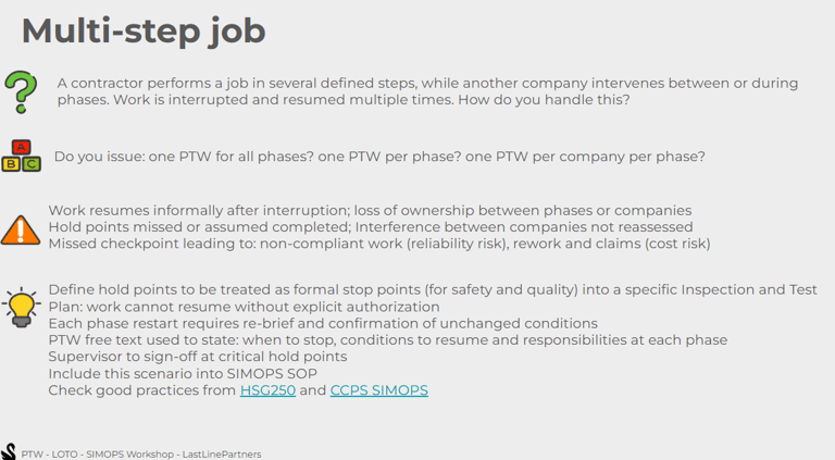 Last Line Partners offers additional workshop themes covering the full spectrum of human factors in the process industry, including Permit-To-Work, Lock-Out/Tag-Out (LOTO), communication, SIMOPS, contractor management, SOP/ESOP design and use, alarm management, HMI, management system checklists, training effectiveness, and operational decision-making.