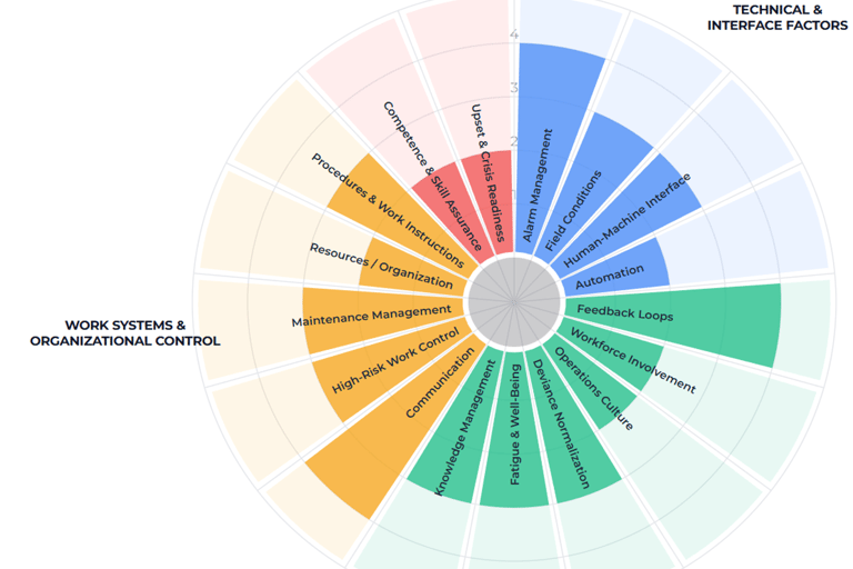 A 360° human factors–focused online assessment designed to identify strengths, vulnerabilities, and clear improvement paths. The assessment comprises 180+ questions covering all key aspects of human reliability at the plant level, structured across four core areas: